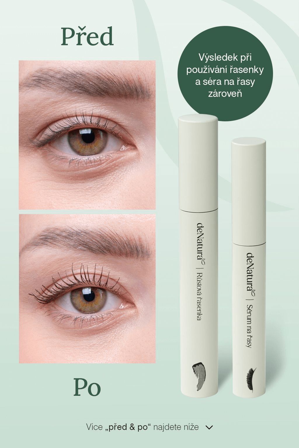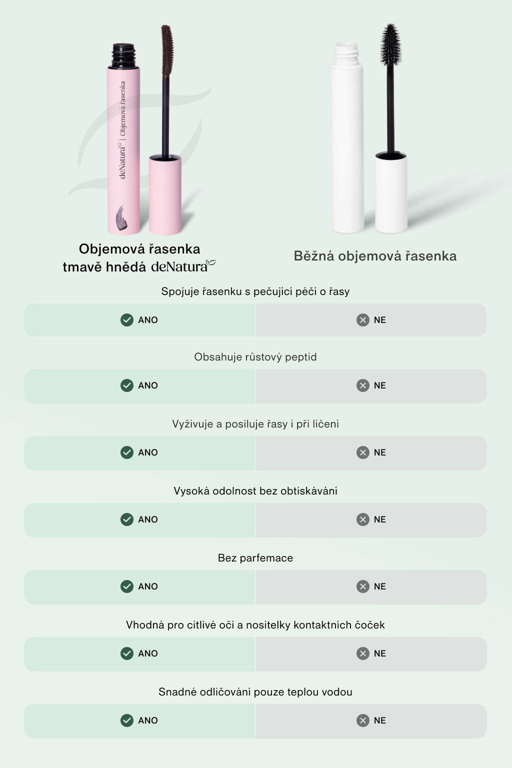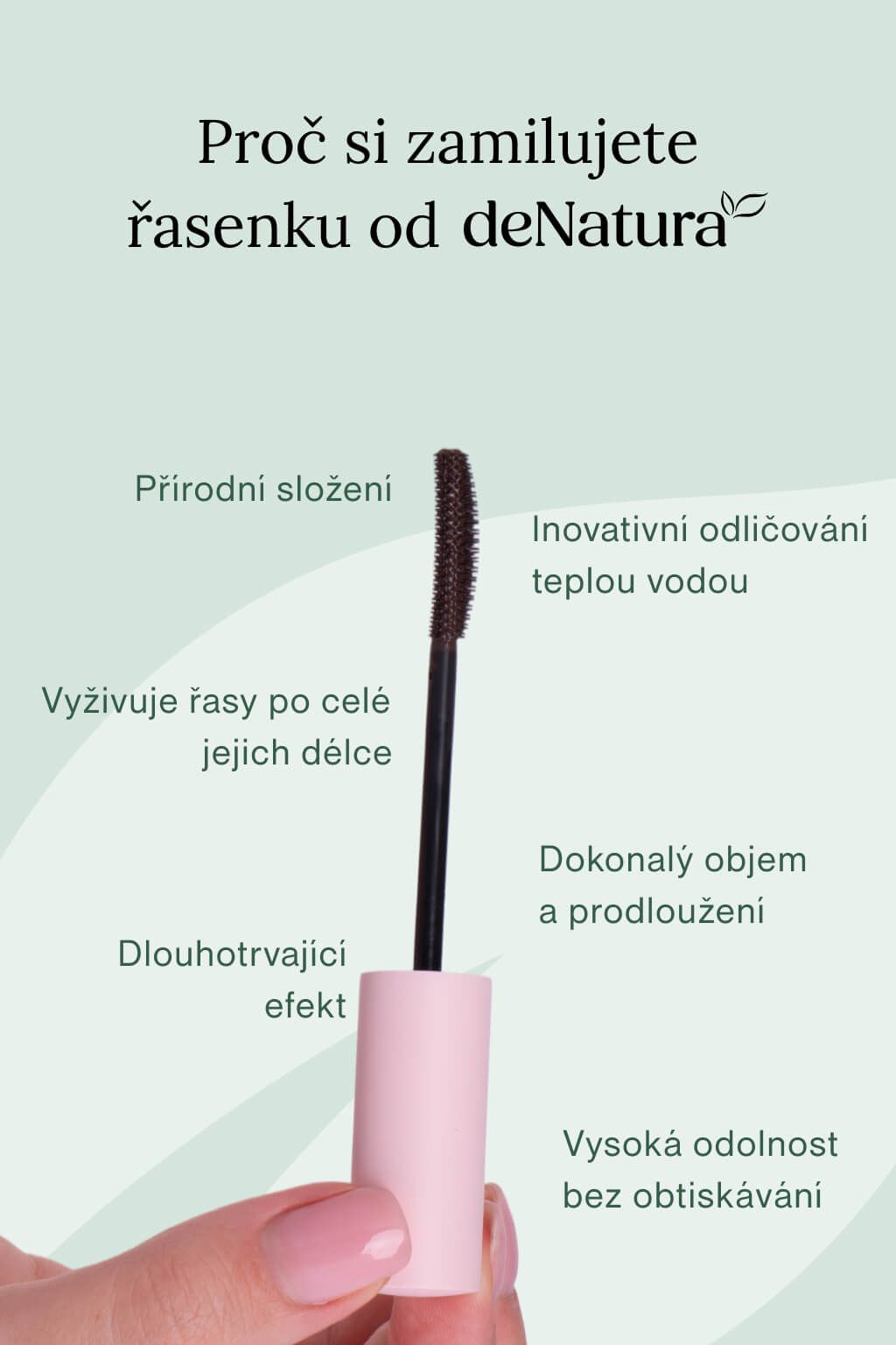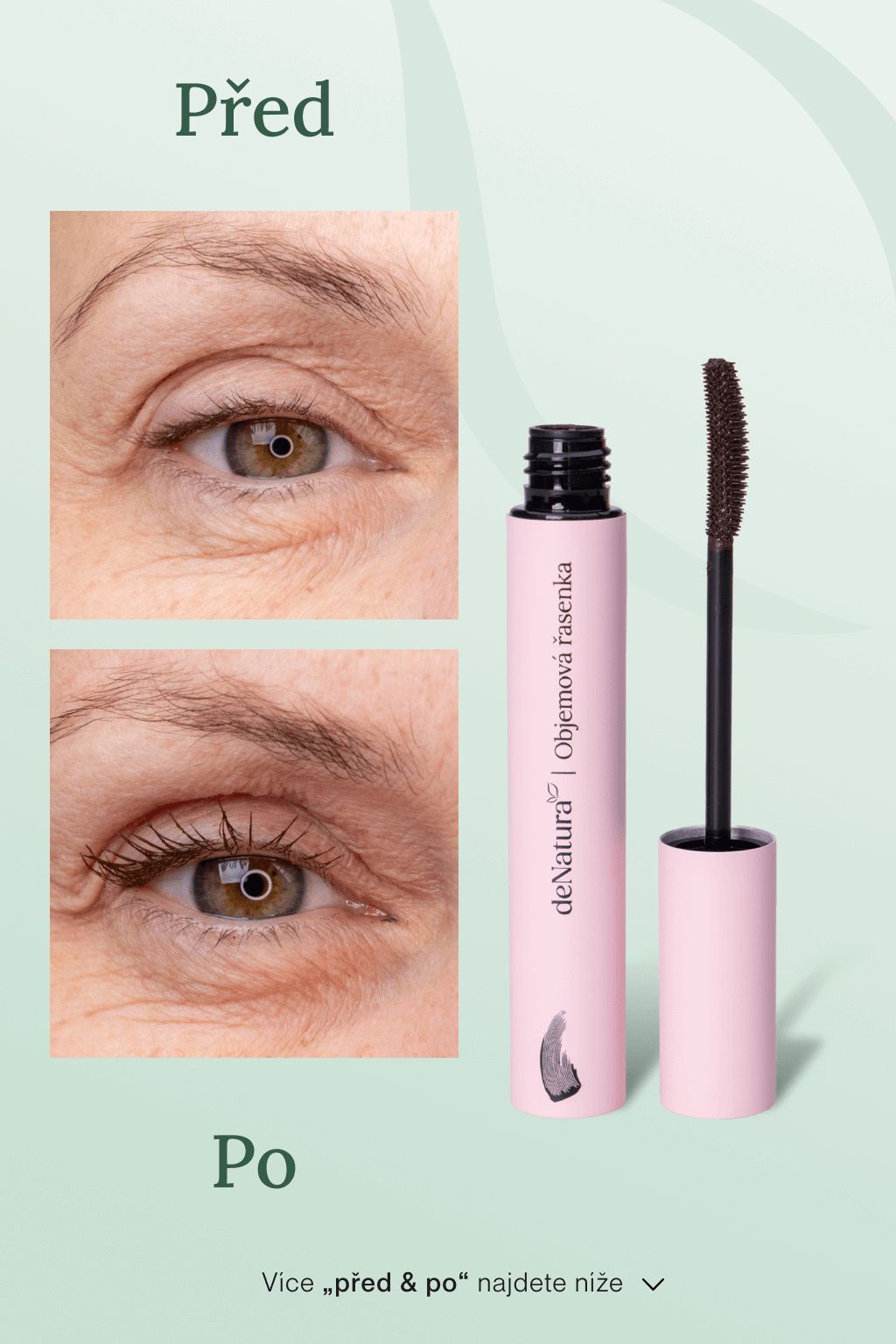 Objemová řasenka deNatura kombinuje viditelné prodloužení řas s péčí, která je během dne posiluje a chrání. Využívá tubing technologii, která každou řasu oddělí a obalí tenkou, pružnou vrstvou polymeru. Díky tomu se řasenka nerozmazává, neobtiskává a drží dokonalý tvar, i když jste celý den v pohybu, jdete si zacvičit nebo si popláčete u filmu. A to nejlepší? Večer ji odlíčíte jen pomocí teplé vody. Když na řasy působí několik sekund teplá voda a tlak prstů, změkne a lze ji šetrně stáhnout bez použití odličovače.
