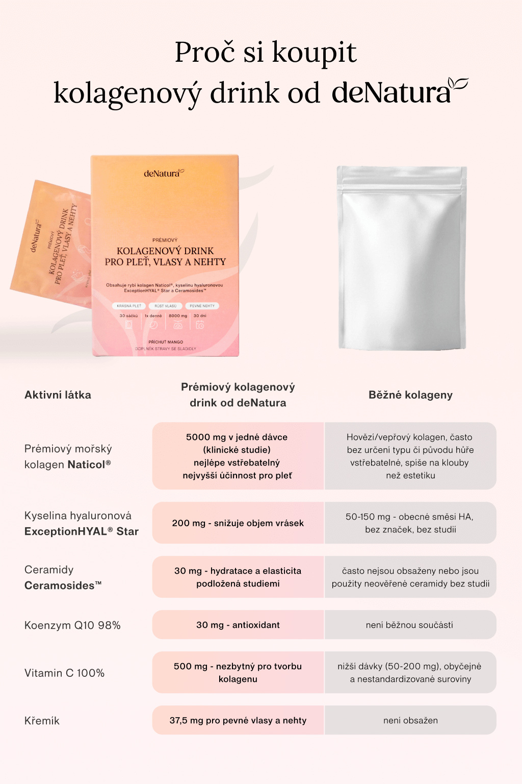 Účinek doplňují vitamín C, koenzym Q10 a křemík – mikroživiny důležité pro tvorbu kolagenu, antioxidační ochranu, pevnost a kvalitu vlasů a nehtů. Kolagenový nápoj má moderní složení bez cukru a umělých sladidel, je jemně ochucený přírodním mangem a každá dávka je přesně odměřená v samostatném sáčku.