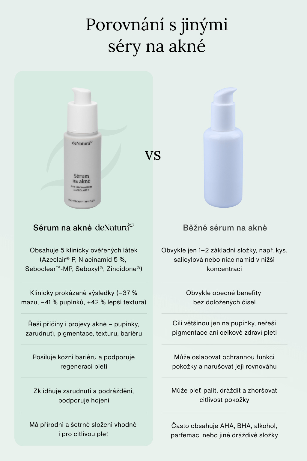 Naše sérum proti akné se liší od běžné kosmetiky na akné tím, že kombinuje vysoké koncentrace 5 klinicky ověřených aktivních látek (5 % Niacinamid, 5 % Azeclair® P, Seboclear™-MP, Seboxyl® a Zincidone®), cíleně působí na příčiny i projevy akné a zároveň je šetrné, protože neobsahuje alkohol, parabeny, esenciální oleje, parfemaci, AHA kyseliny, kyselinu salicylovou ani retinoidy, které často způsobují podráždění.