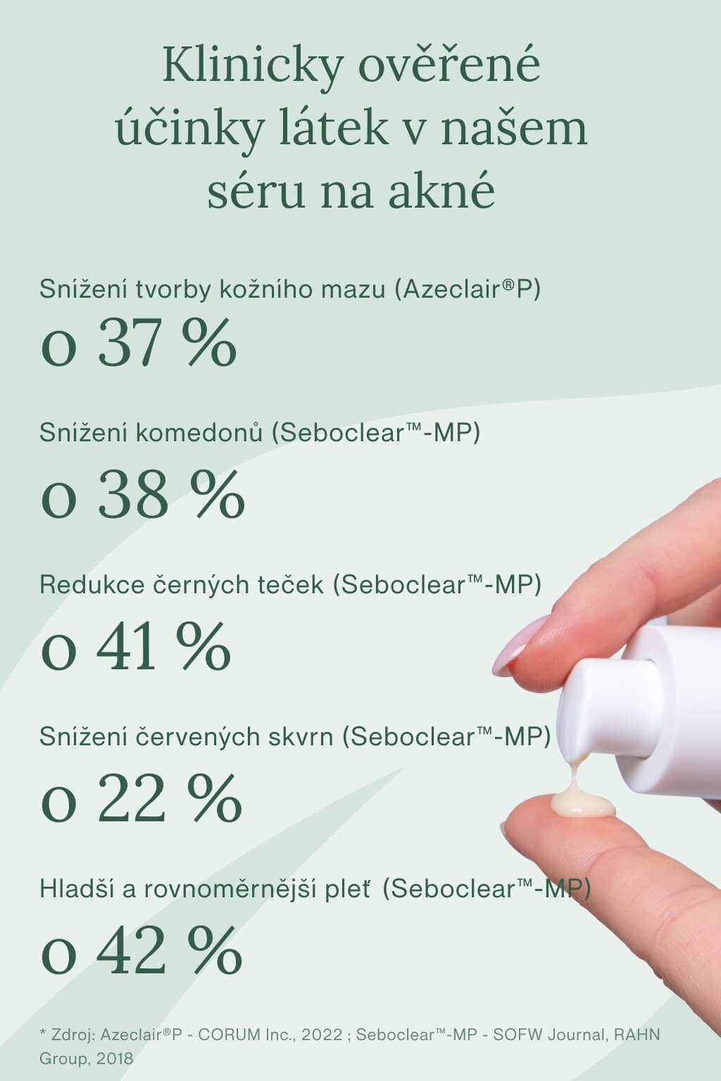 Na rozdíl od klasického séra s kyselinou azelaovou naše přírodní sérum na akné obsahuje moderní derivát kyseliny azelaové s glycinem (Azeclair® P), který je šetrný, nedráždí pokožku a zároveň prokazatelně reguluje maz o více než 37 % během 28 dní a zlepšuje texturu pleti.