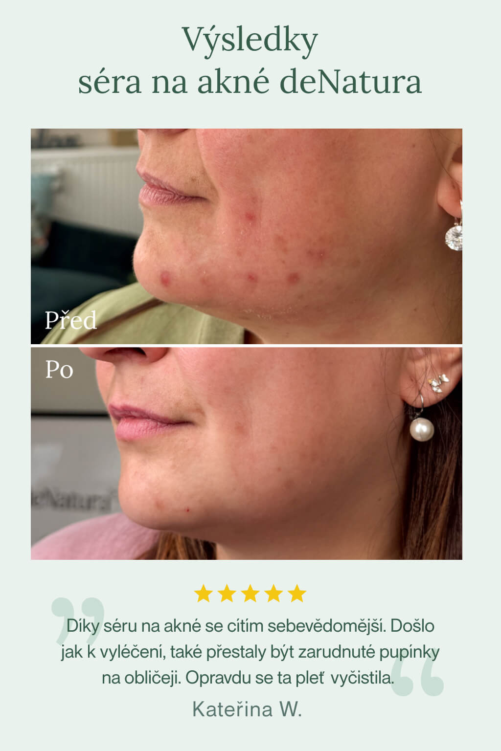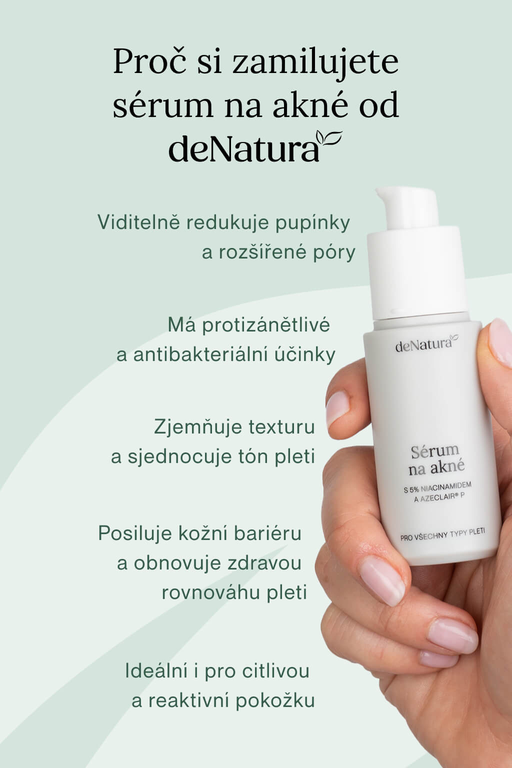 Obsahuje 99,94 % přírodních ingrediencí Přírodní sérum na akné jemně, ale účinně působí proti pupínkům, černým tečkám, nadměrné tvorbě mazu i rozšířeným pórům. Kombinace klinicky ověřených aktivních látek reguluje maz, rozjasňuje pleť a redukuje pigmentové skvrny po akné. Sérum zároveň zklidňuje zarudnutí a podráždění, podporuje hojení a viditelně zlepšuje texturu i sjednocení pleti.