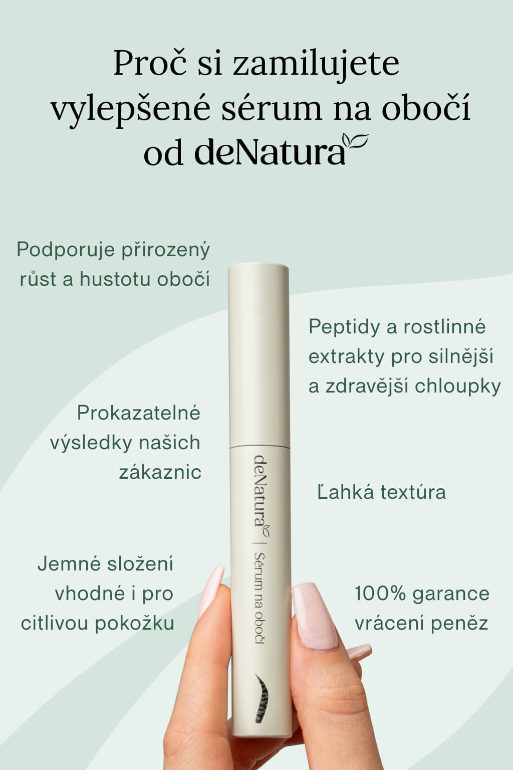 Nové sérum na obočí deNatura kombinuje několik klíčových skupin účinných složek, které stimulují růst chloupků obočí a zlepšují jejich kvalitu. Základem je rozšířený komplex bioaktivních peptidů, který jsme nově doplnili o další peptid pro ještě intenzivnější péči, rostlinné extrakty a moderní biotechnologickou aktivní látku z kmenových buněk kurkumy. O hloubkovou hydrataci a posílení struktury chloupků se pak stará synergicky působící mix kyseliny hyaluronové, panthenolu, biotinu a vitamínu E.