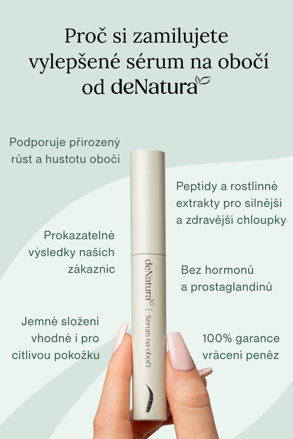 Nové sérum na obočí deNatura kombinuje několik klíčových skupin účinných složek, které stimulují růst chloupků obočí a zlepšují jejich kvalitu. Základem je rozšířený komplex bioaktivních peptidů, nově doplněný o další peptid pro ještě intenzivnější péči, rostlinné extrakty a moderní biotechnologická aktivní látka z kmenových buněk kurkumy. Složení dále doplňují synergicky působící látky jako kyselina hyaluronová, panthenol, biotin a vitamín E.