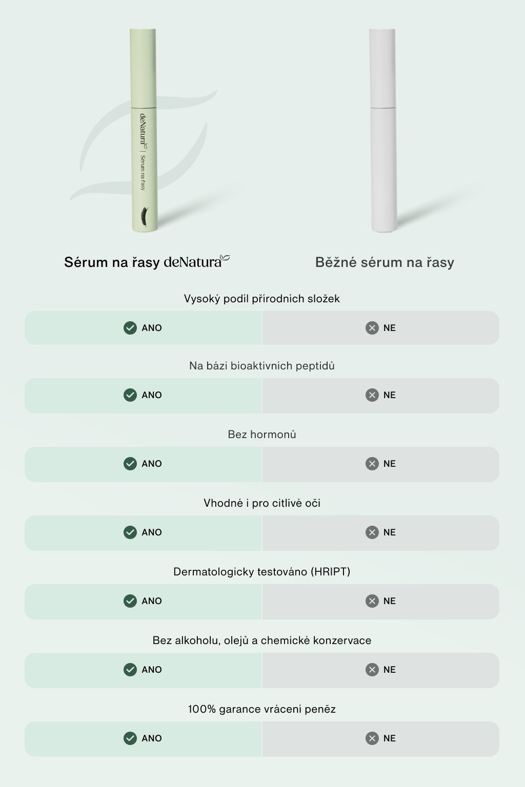 Naše séra na řasy a obočí obsahují vysoký podíl přírodních složek jako jsou rostlinné extrakty a vitamíny. Současně ve složení najdete bezpečné syntetické bioaktivní peptidy, které účinně stimulují folikuly řas k produkci keratinu, hlavního proteinu řas a obočí, posilují je a prodlužují anagenní růstovou fázi. Mezi další složky patří také kyselina hyaluronová nebo panthenol. Sérum je bez chemické konzervace, parfemace a neobsahuje žádná analoga prostaglandinů, která se chovají jako hormony a způsobují pověstné nežádoucí účinky. Kompletní složení naleznete na našich webových stránkách zde: https://www.denatura.cz/slozeni/.