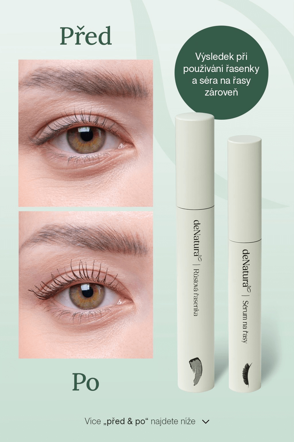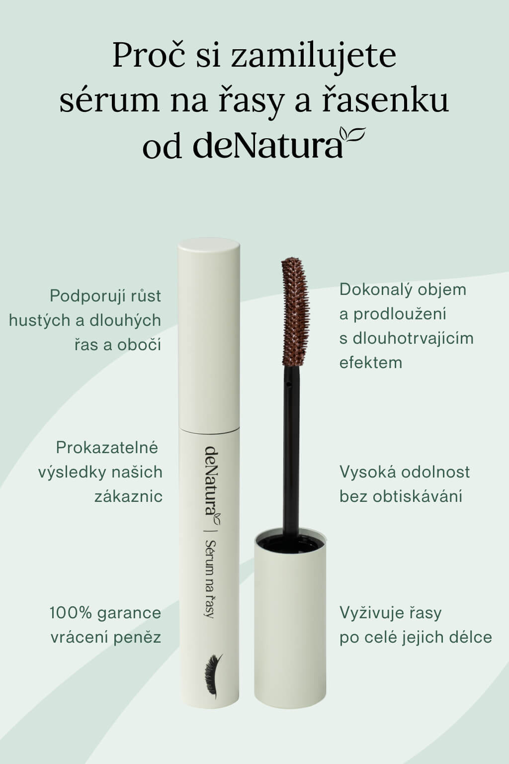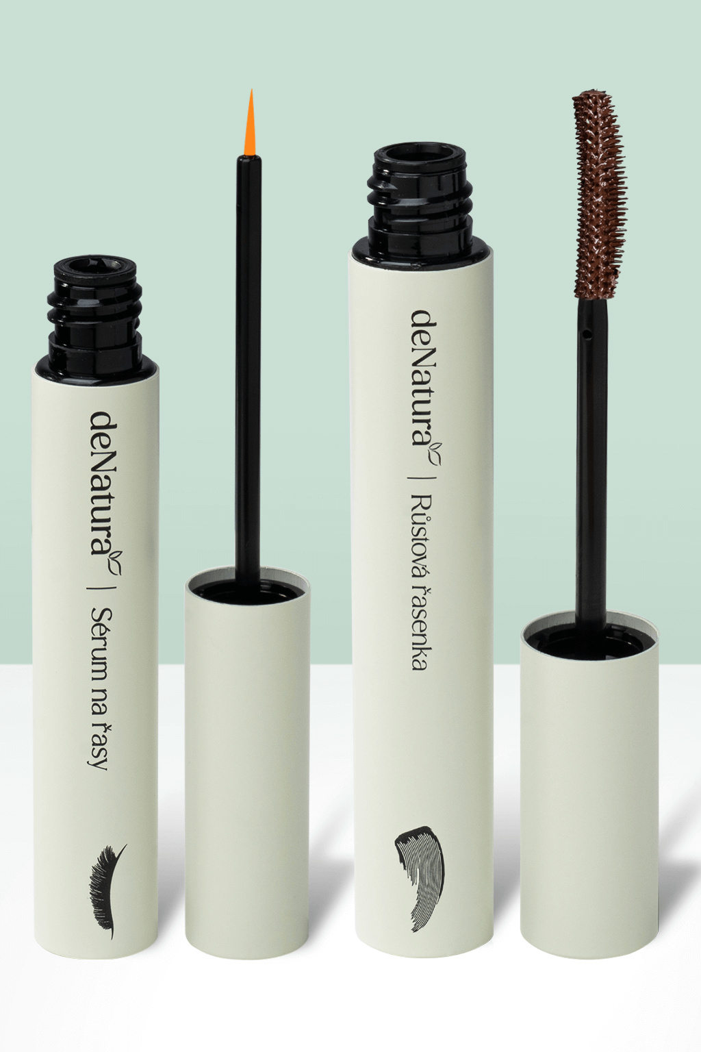 Naše séra na řasy a obočí obsahují vysoký podíl přírodních složek jako jsou rostlinné extrakty a vitamíny. Současně ve složení najdete bezpečné syntetické bioaktivní peptidy, které účinně stimulují folikuly řas k produkci keratinu, hlavního proteinu řas a obočí, posilují je a prodlužují anagenní růstovou fázi. Mezi další složky patří také kyselina hyaluronová nebo panthenol. Sérum je bez chemické konzervace, parfemace a neobsahuje žádná analoga prostaglandinů, která se chovají jako hormony a způsobují pověstné nežádoucí účinky. Kompletní složení naleznete na našich webových stránkách zde: https://www.denatura.cz/slozeni/.